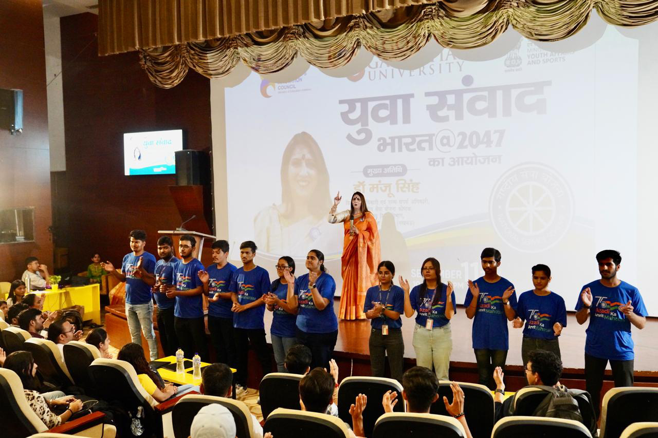 गलगोटियास विश्वविद्यालय के एन० एस० एस० विभाग ने “युवा संवाद भारत @ 2047” के कार्यक्रम का किया भव्य आयोजन।  इस कार्यक्रम में आदरणीया श्रीमति मँजू सिंह मैम (ओएसडी) विशेष कार्य अधिकारी एवम् राज्य संपर्क अधिकारी राष्ट्रीय सेवा योजना कोष्ठक “उच्च शिक्षा विभाग” (उत्तर प्रदेश शासन लखनऊ) मुख्य अतिथि के रूप में पहुँची। उनकी गरिमामयी उपस्थिति ने पूरे वातावरण को ऊर्जावान बना दिया।